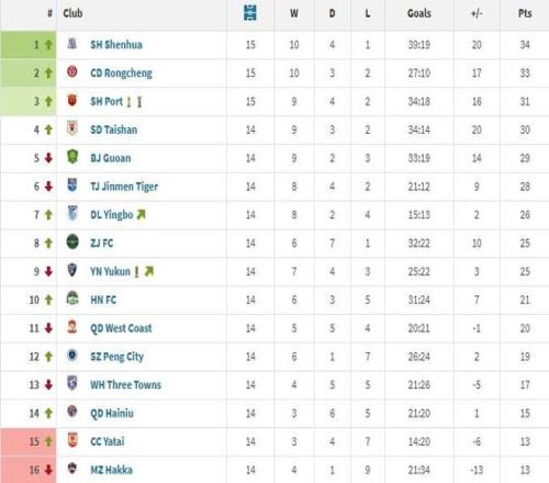 1-上海申花 15场 34分 2-成都蓉城 15场 33分 3-上海海港 15场 31分 4-山东泰山 14场 30分 5-北京国安 14场 29分 6-天津津门虎 14场 28分 7-大连英博 14场 26分 8-浙江 14场 25分 9-云南玉昆 14场 25分(净胜球落后于浙江) 10-河南 14场 21分 11-青岛西海岸 14场 20分 12-深圳新鹏城 14场 19分 13-武汉三镇 14场 17分 14-青岛海牛 14场 15分 15-长春亚泰 14场 13分 16-梅州客家 14场 13分(净胜球落后于长春亚泰) |
