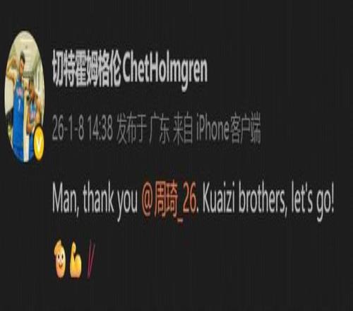 北京时间1月8日,雷霆球员切特-霍姆格伦在微博发了视频,感谢了北京北汽球员周琦为自己的全明星拉票。